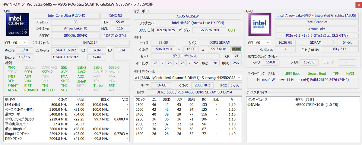 「HWiNFO 64 Pro」で取得したシステムの概要。試用機のスペックはCore Ultra 9 275HX/ GeForce RTX 5080/ メモリー32GB(DDR-5600)/ ストレージ1TB(PCIe Gen4 x4接続SSD)