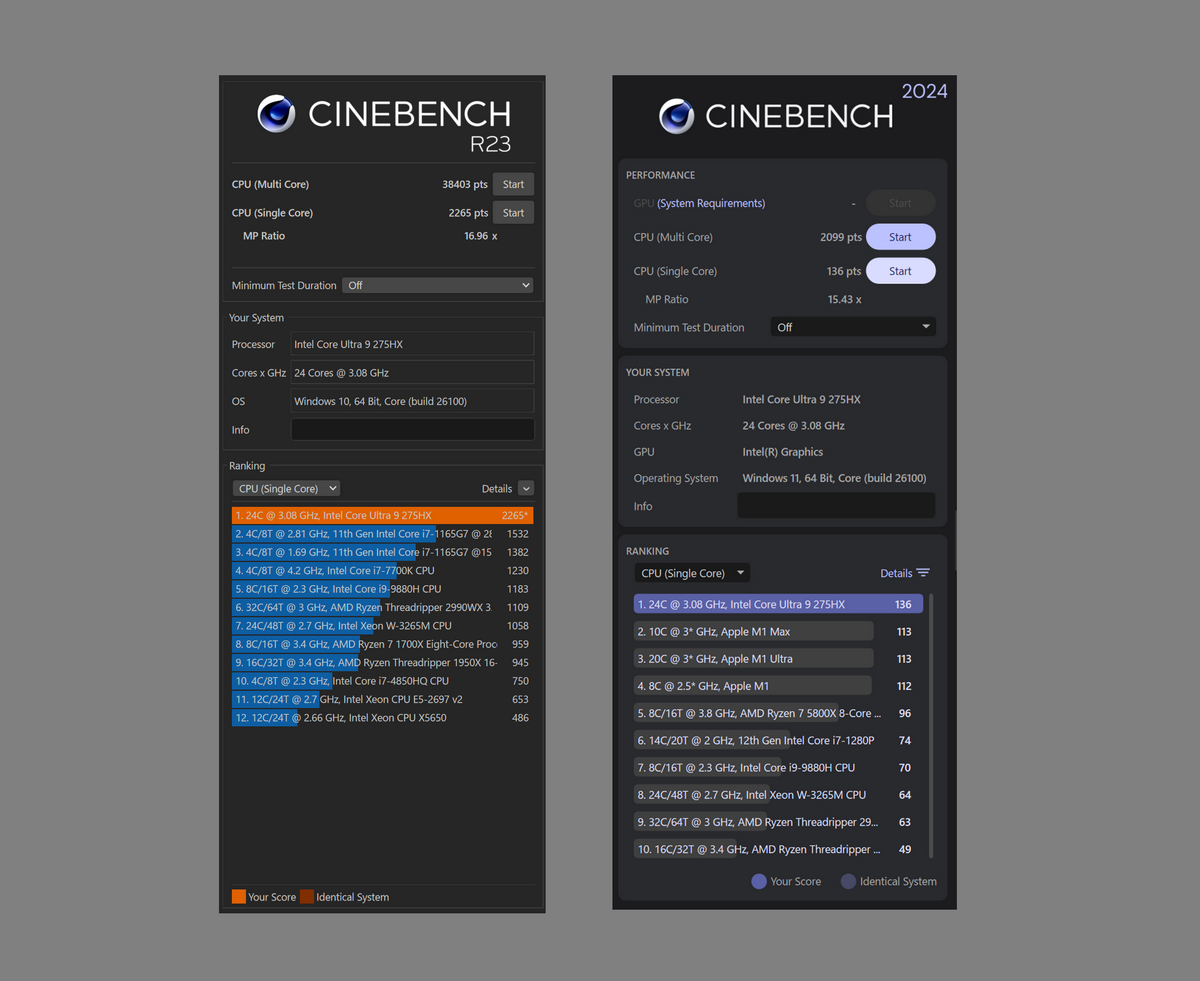 「CINEBENCH R23」のCPU(Multi Core)は38403pts、CPU(Single Core)は2265pts、「CINEBENCH 2024」のCPU(Multi Core)は2099pts、CPU(Single Core)は2099pts