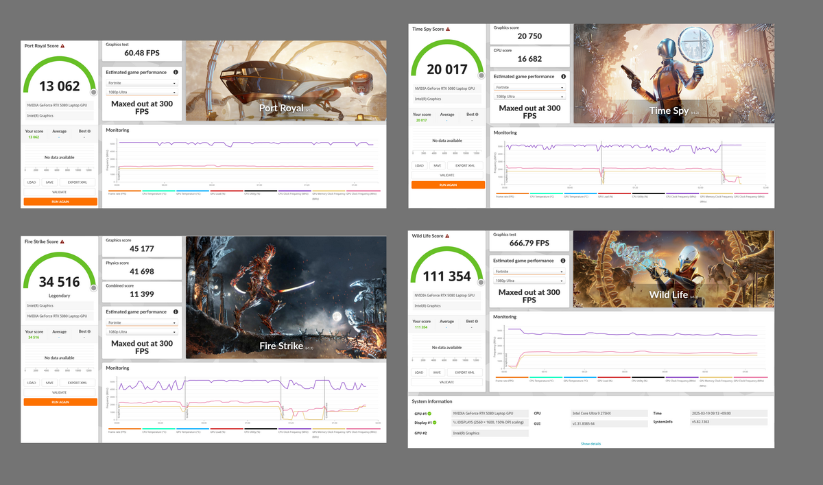 3Dグラフィック性能については、「3DMark」のPort Royalで13062、Time Spyで20017、Fire Strikeで34516、Wild Lifeで111354を記録した。「GeForce RTX 4090」搭載機と比較すると、「3DMark」の結果は一勝三敗だ。