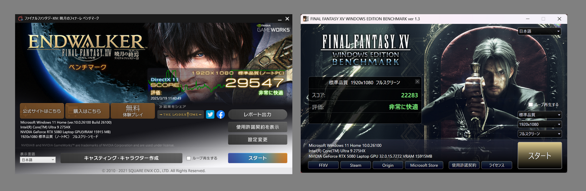 「ファイナルファンタジーXIV:暁月のフィナーレベンチマーク」(1920×1080ドット、標準品質、ノートPC)のスコアは29547(非常に快適)、「FINAL FANTASY XV WINDOWS EDITION BENCHMARK ver 1.3」(標準品質、1920×1080ドット、フルスクリーン)のスコアは22283(非常に快適)