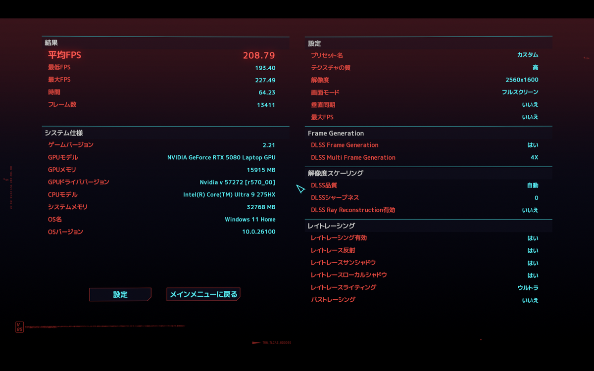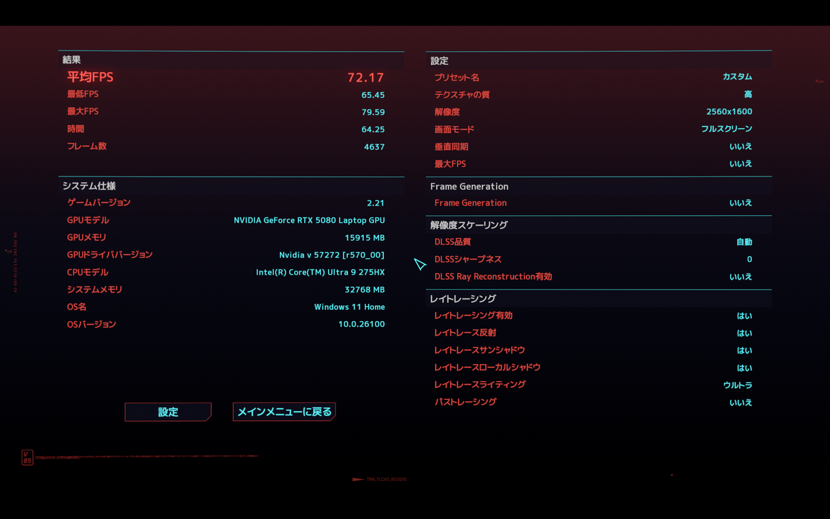 さて冒頭でもお伝えしたが、GeForce RTX 50シリーズの売りのひとつが「NVIDIA DLSS 4」をサポートしていること。そこで今回は、「Cyberpunk 2077」で「DLSS Frame Generation」無効時と有効時で、どのぐらいフレームレートが変わるのか試してみた。