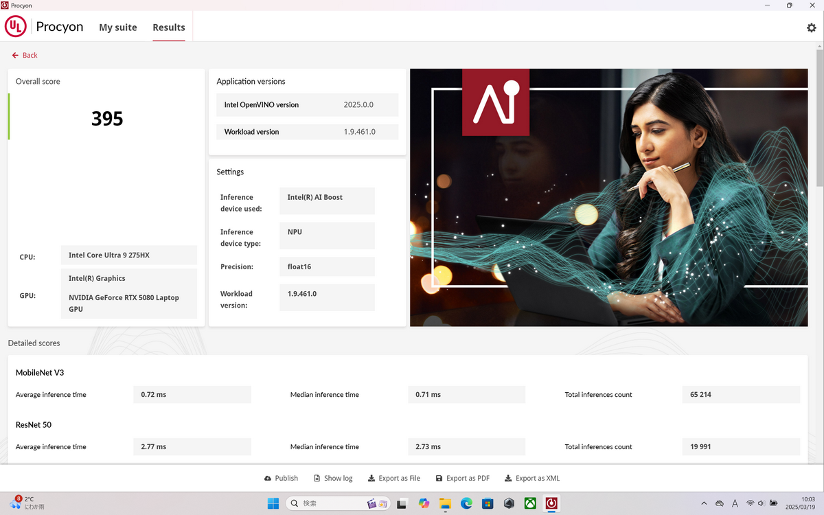「Procyon」のAI Computer Vision Benchmarkのスコアは395。「Core Ultra 9 275HX」のNPU「Intel AI Boost」の処理能力は13TOPSなので、AIアプリケーション利用時の処理速度、省電力性は「Copilot+ PC」には及ばないことになる。
