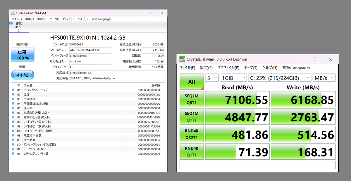 ストレージはPCIe Gen4 x4接続SSD「HFS001TEJ9X101N」を搭載、「CrystalDiskMark」のシーケンシャルリード(SEQ1M Q8T1)は7106MB/s、シーケンシャルライト(SEQ1M Q8T1)は6168MB/s