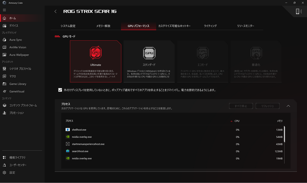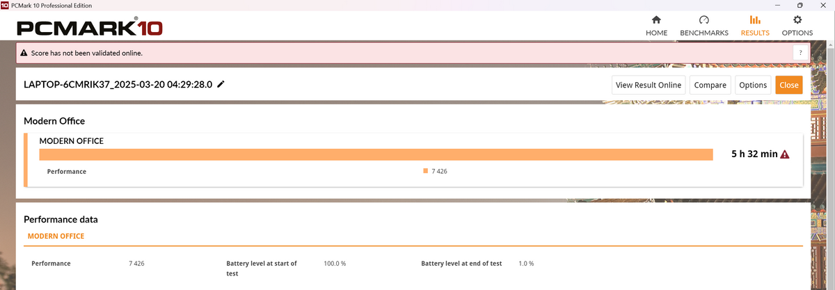 バッテリー駆動時間については、「Armoury Crate」で動作モードを「サイレント」、GPUモードを「エコモード」に設定して「PCMark 10 Gaming Battery Life」を実行したところ5時間32分動作した。