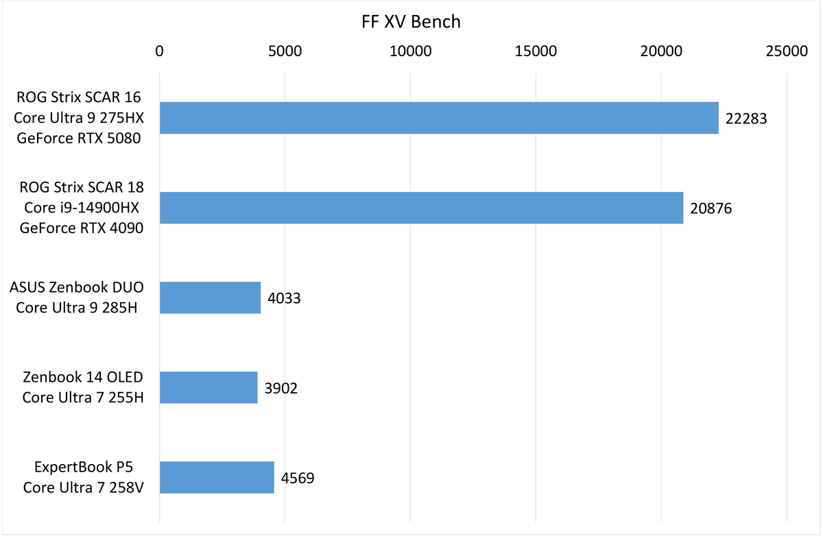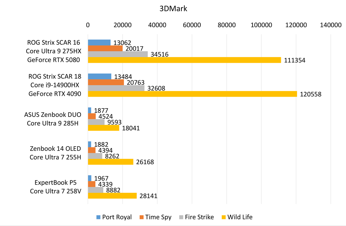 比較対象機種は、「Core i9-14900HX」搭載「ROG Strix SCAR 18 G834JYR」、「Core Ultra 9 285H」搭載「Zenbook DUO (2025) UX8406」、「Core Ultra 7 255H」搭載「Zenbook 14 OLED (UX3405) 」、「Core Ultra 7 258V」搭載「ExpertBook P5」だ。