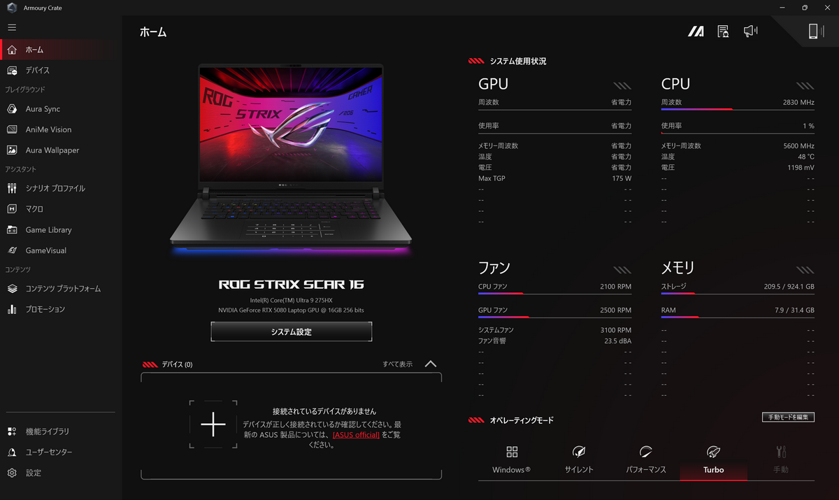 今回試用した「ROG Strix SCAR 16」は、5090ではなく5080を搭載する下位モデル。とは言え、「Core Ultra 9 275HX」との組み合わせは、直近でレビューしたノートPCのなかでは最上位スペックだ。