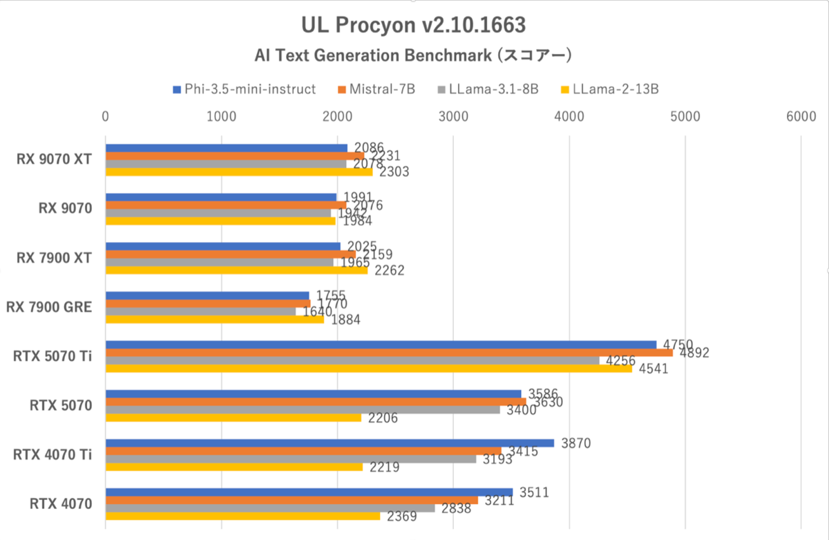 これは以前から確認できていた傾向だが、RX 9070シリーズにおいてもその傾向が継承されていることがわかった。肝心のRX 9070シリーズはRX 7900 XTやRX 7900 GREに対してどのテストにおいても推論回数で上回っており、順当な進化であることが感じられる(RX 7900 GREがRX 7900 XTよりも推論回数で上回っているのは謎である)。