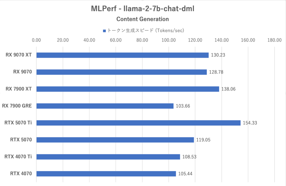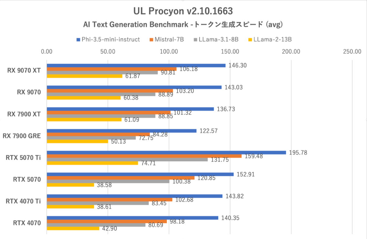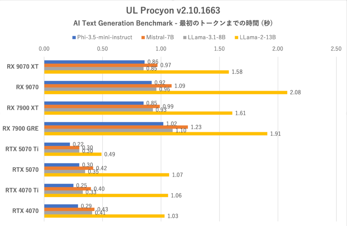 ただトークンの生成スピード(文章が出始めてから出力される速度)においては、RX 9070シリーズはRTX 5070のすぐ後ろに迫っている。特にパラメーター数の多いLLama-2-13BではVRAM 12GBのGeForce勢(RTX 5070など)はVRAMが足りなくなって速度が落ちているが、VRAM 16GBを備えるRX 9070シリーズはトークン生成スピードにおいて上回っている。
