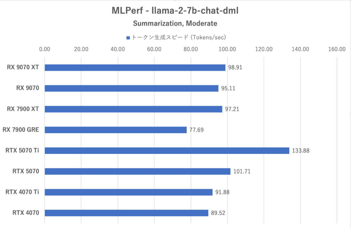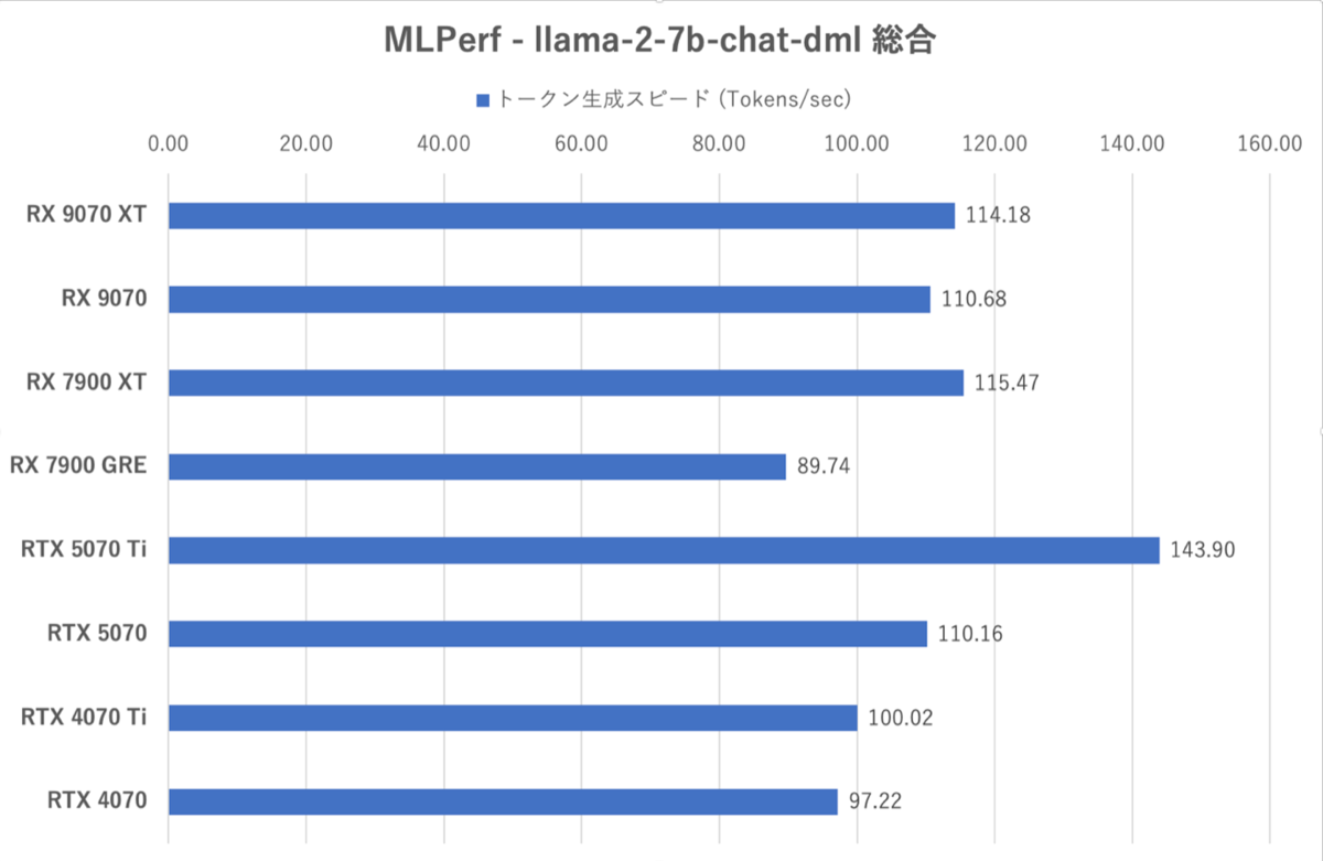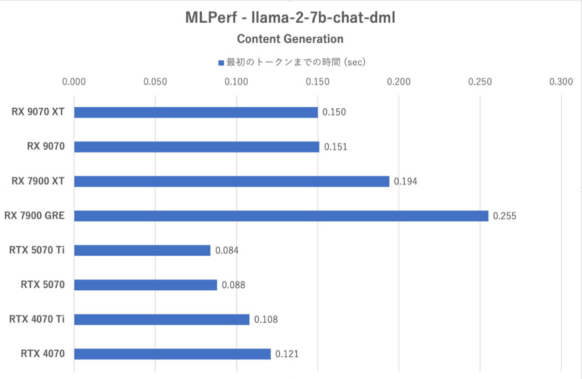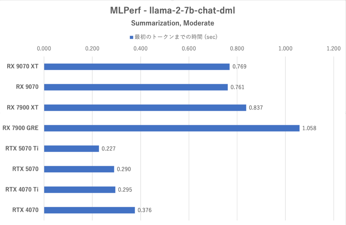 MLPerfではRX 9070シリーズのトークン生成スピードはRTX 5070を上回っている一方で、最初のトークンまでの時間が長く、RDNA 4になってもLLMでは長考しやすいことが示されている。RX 9070シリーズはXTと無印の性能差が小さく、特に格下のRX 7900 GREに比べると格段に性能が改善されている。まだGeForce勢には及ばない部分があるがRDNA 3よりも“使える”ようになってきたと言うべきか。