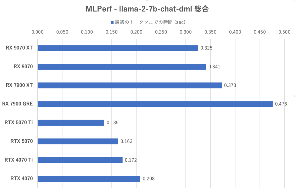 トークン生成スピードにおいてGeForce勢と遜色のないRX 9070シリーズがなぜ総合スコアーで奮わないかといえば、それはRadeonが長考傾向にあるからだ。最初のトークンまでの時間を見るとRX 9070 XTでもRTX 5070の2〜4倍程度の時間を要している。