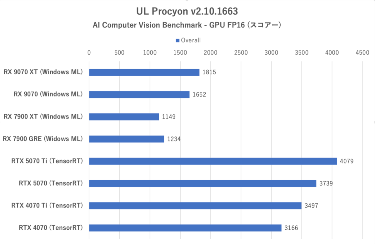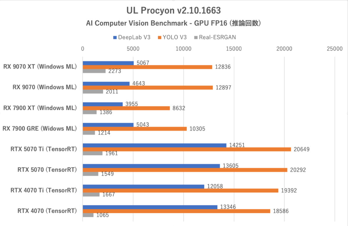 続いては画像認識や超解像といったAI処理性能を見るUL Procyonの“AI Computer Vision Benchmark”である。ここでは推論エンジンのAPIがGPUによって異なる。Radeon勢は「Windows ML」、GeForce勢は「TensorRT」を利用する。RTX 5070リリーズが発売された段階でようやくRTX 50シリーズ対応のTensorRTがUL Procyonに組み込まれたのでこのテストを実施した次第だ。