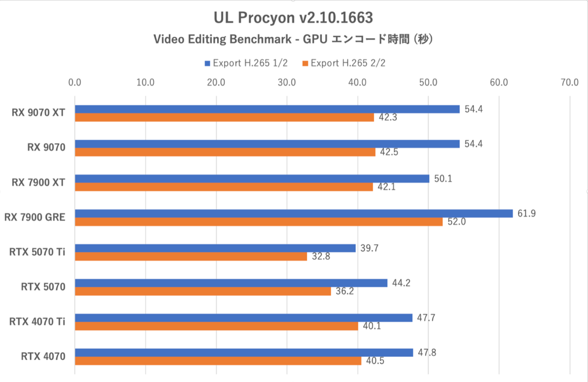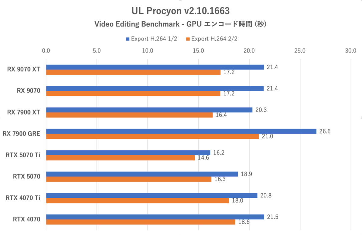 Radeon勢の中ではRX 7900 XTがH.264/ H.265ともに最速で処理を終えているが、RX 9070シリーズとの差は1〜4秒と僅差にとどまる。しかしRX 9070シリーズより格下にあたるRX 7900 GREに対しては5〜6秒早く処理を終えているなど、新世代のRadeonはエンコード処理も強化されていることを示した。