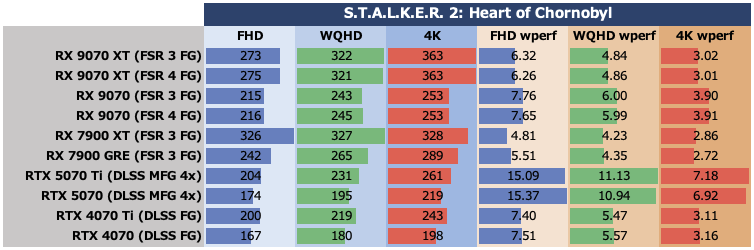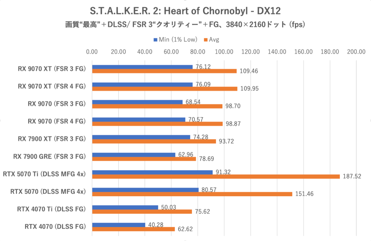 S.T.A.L.K.E.R. 2: Heart of Chornobylでは画質“ウルトラ”、DLSS/ FSR 3 “クオリティー”およびフレーム生成も追加、さらにRTX 5070およびRTX 5070 TiはDLSS MFG (4x)に設定。ゲーム中最初に到達する拠点内において一定のコースを移動した際のフレームレートを計測した。