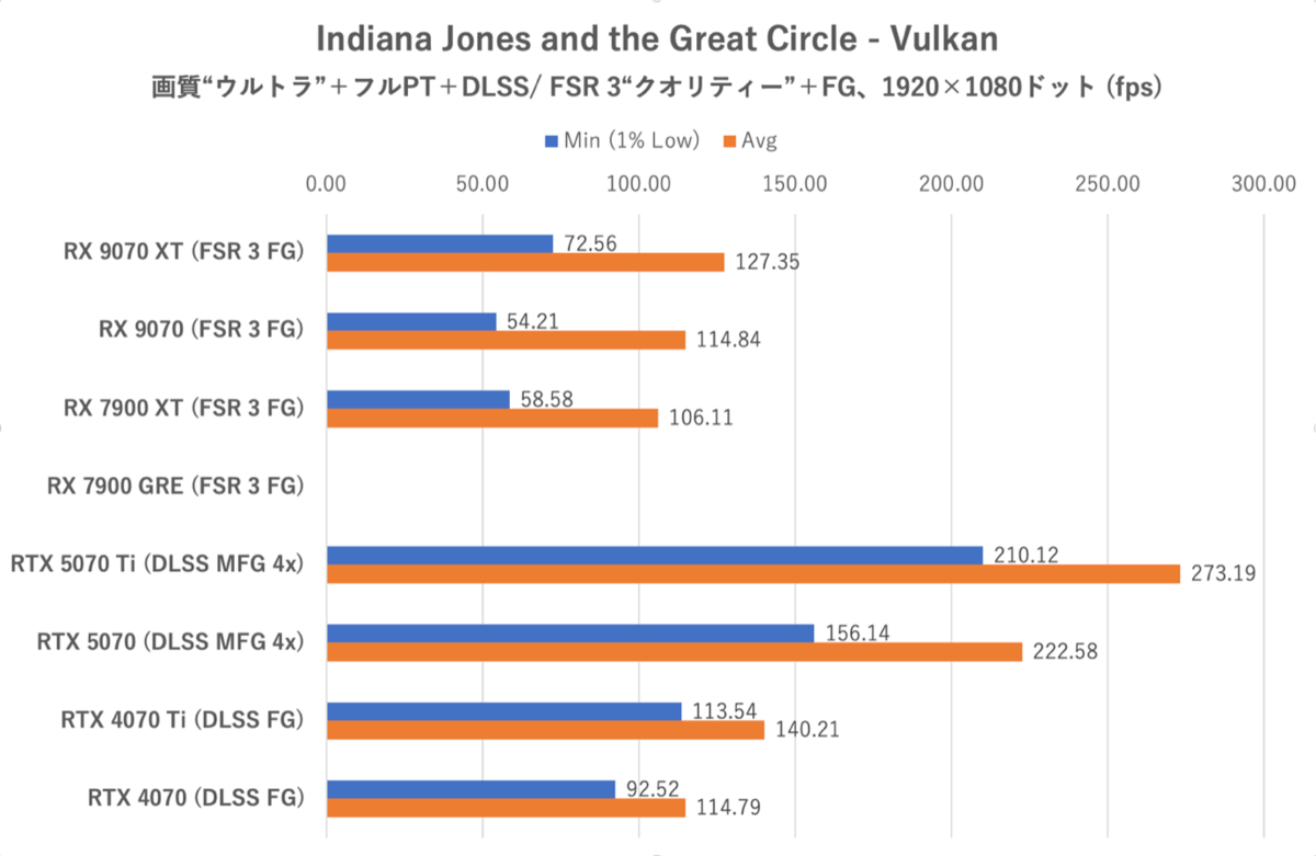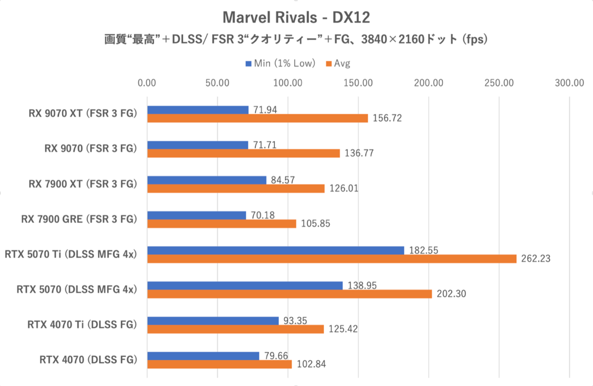 DLSS MFGが出てくるとマルチフレーム生成に対応していないRadeon勢はどうしても見劣りしてしまうのは致し方ない。ただRTX 40シリーズや既存のRX 7900 XTおよびRX 7900 GREと比較するとRX 9070シリーズは着実に1ランク以上高いフレームレートを出せている点は素晴らしい。