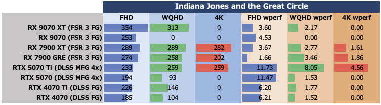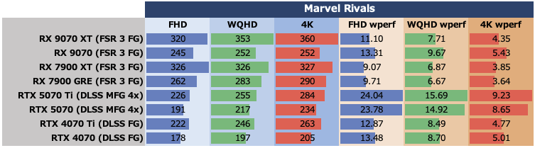TBPの傾向は他のゲームと同じ。特にRX 9070 XTのTBPが高いが、ワットパフォーマンス的は今ひとつな結果に終わっている。ここでもRX 9070のワットパフォーマンスはRTX 40シリーズと比べても1枚上手だ。