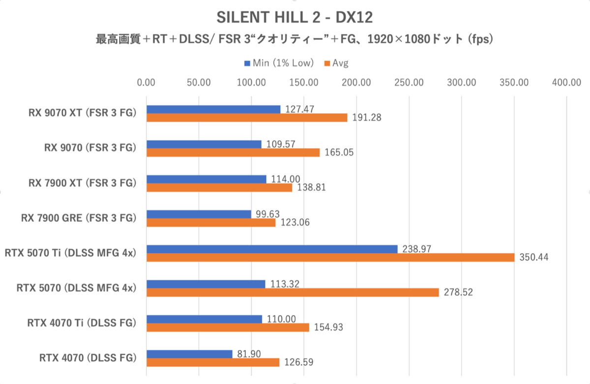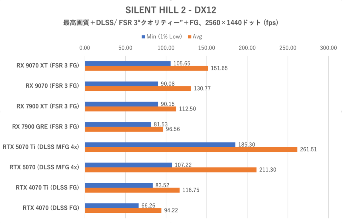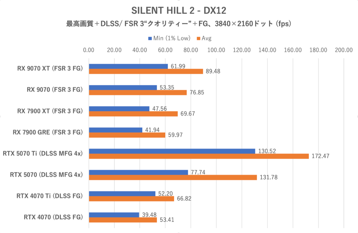 SILENT HILL 2は画質“最高”、レイトレーシングをオンに設定。DLSS/ FSR 3 “クオリティー”、フレーム生成やDLSS MFG (4x)も有効化。新ゲーム開始直後、下山〜最初のカットシーン直前までのコースを移動した際のフレームレートを計測した。