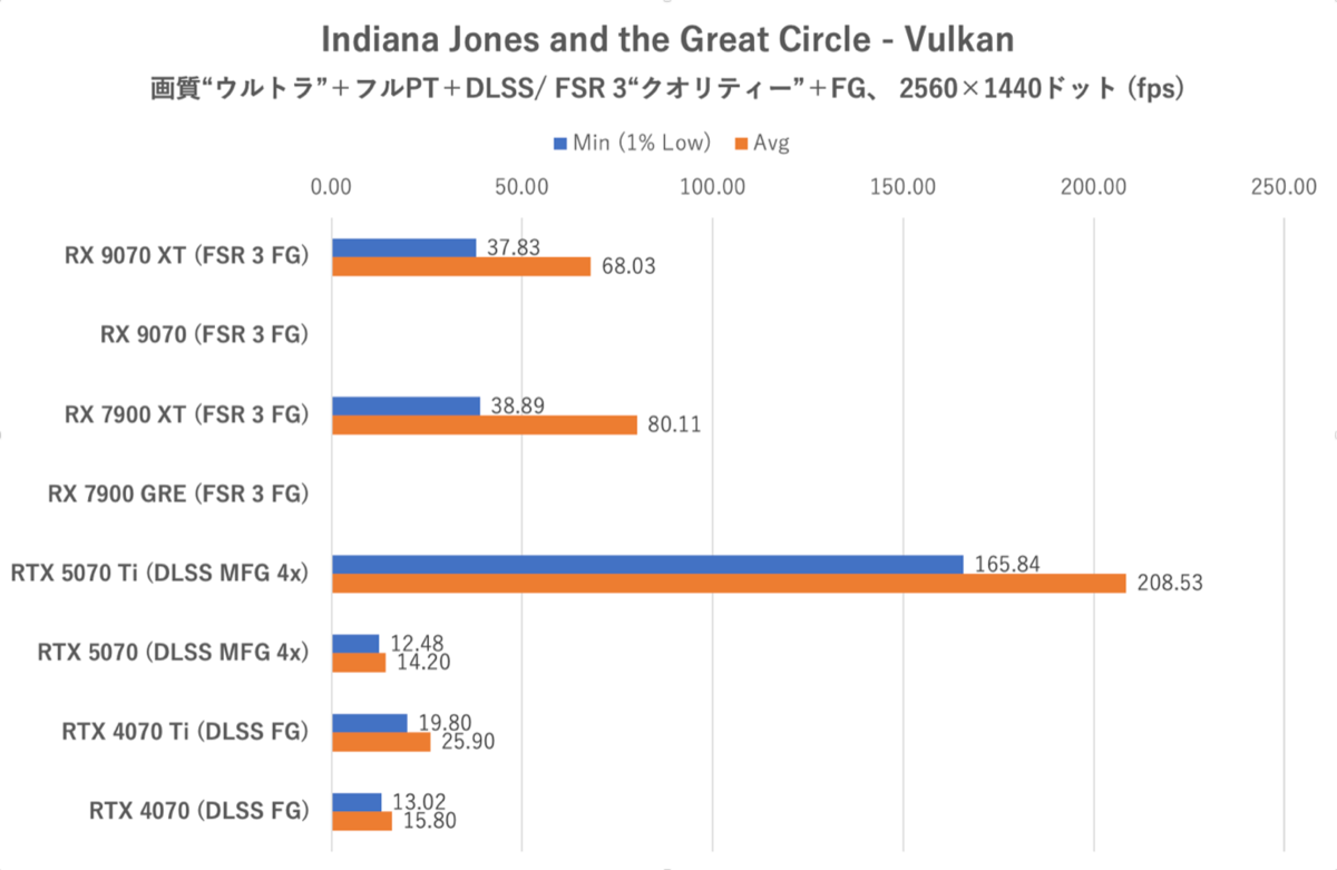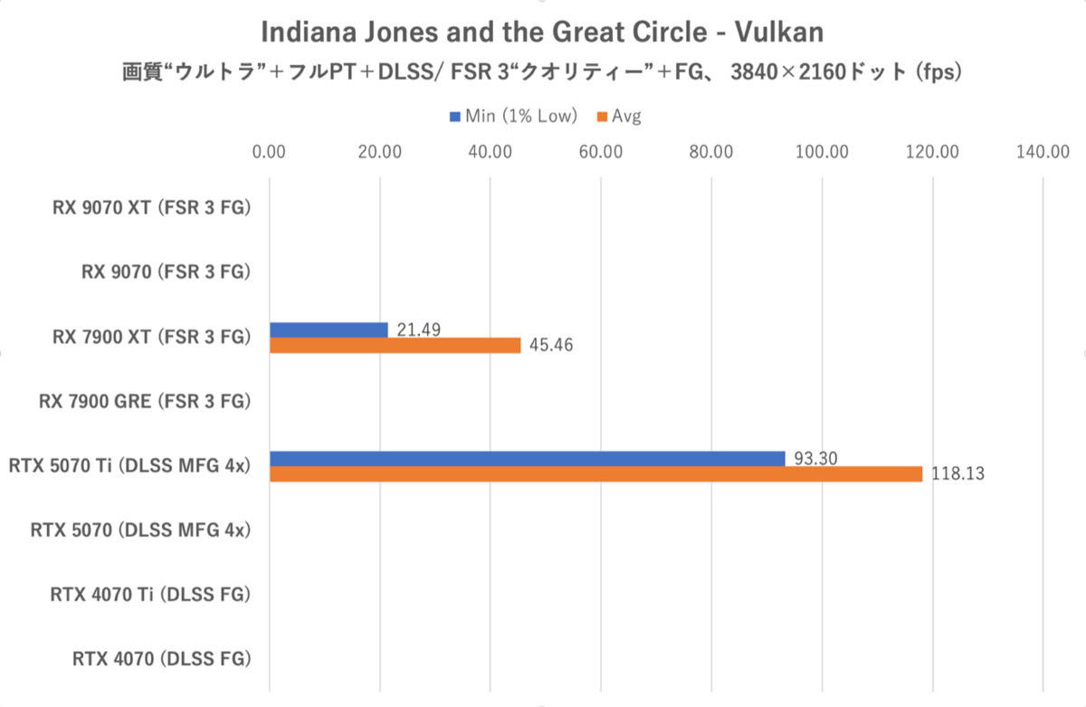 本ゲームにおけるフルパストレーシング設定は極めてVRAM消費量が多いため、GPUのスペック次第ではメニュー画面から動けなくなる。グラフで数値のないものはすべてそういった“計測に値しない”状況であることを示している。
