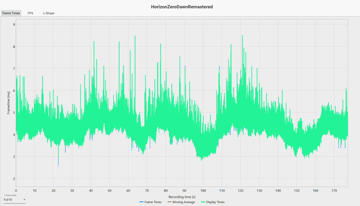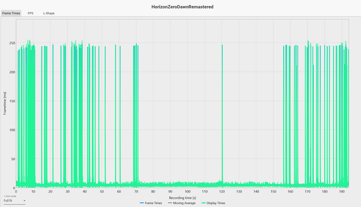 Horizon Zero Remastered+RX 9070 XTにおけるフレームタイム。縦軸の数値を見れば、下の方を這っているように見える部分が1つ前の画像の部分であることに気がつくだろう。今回の検証ではRX 9070シリーズにこのような挙動が出た