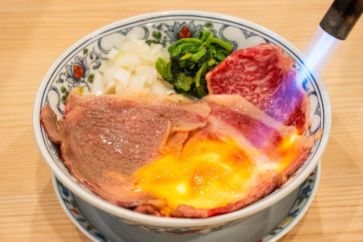こだわりの「和牛すき焼き豚骨ラーメン」は、濃厚な豚骨スープの上に、贅沢に炙りトッピングされた和牛のサーロインが乗っている。目の前で肉を炙る演出は、ただ食べるだけでは得られないエンターテインメント性を提供する。濃厚なスープととろけるような味わいの和牛が、見事に調和する一杯だ。