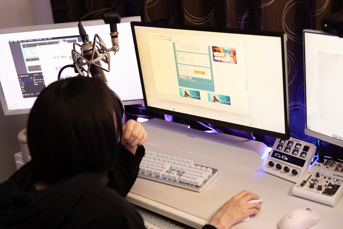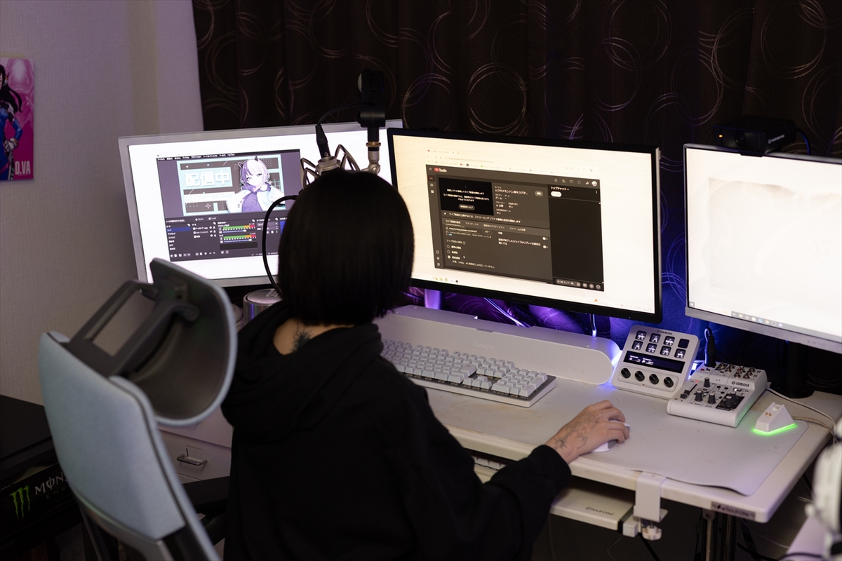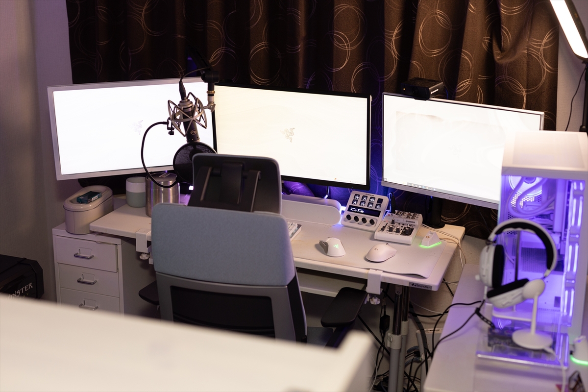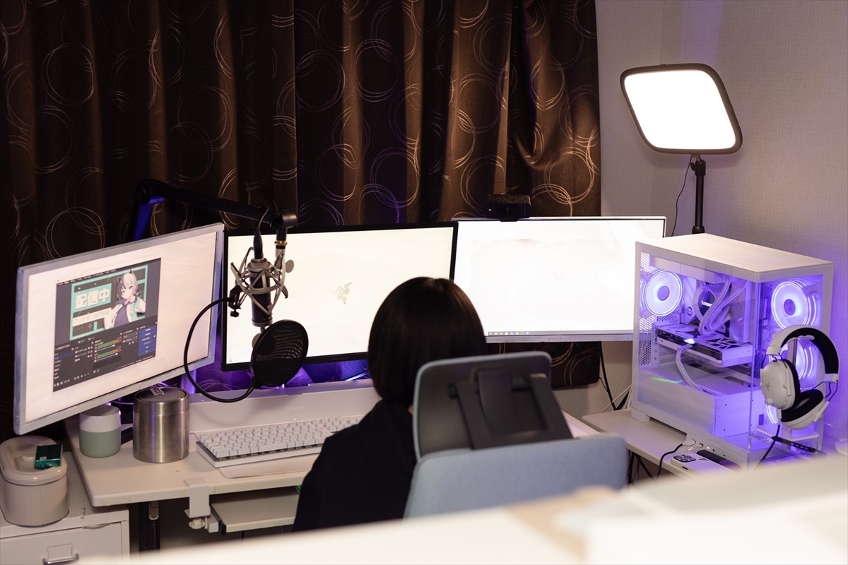 まずはネット環境を見せてもらうため、はつめさんのお部屋を探訪! 大きな白の長机の上には、モニターが3枚置かれ、近くには配信機器がズラリ。有名ブランドのゲーミングチェアに、ファンが光っているなどピラーレスケースのゲーミングPCと、ゲーマーやストリーマーなら誰もが憧れる空間が広がります。