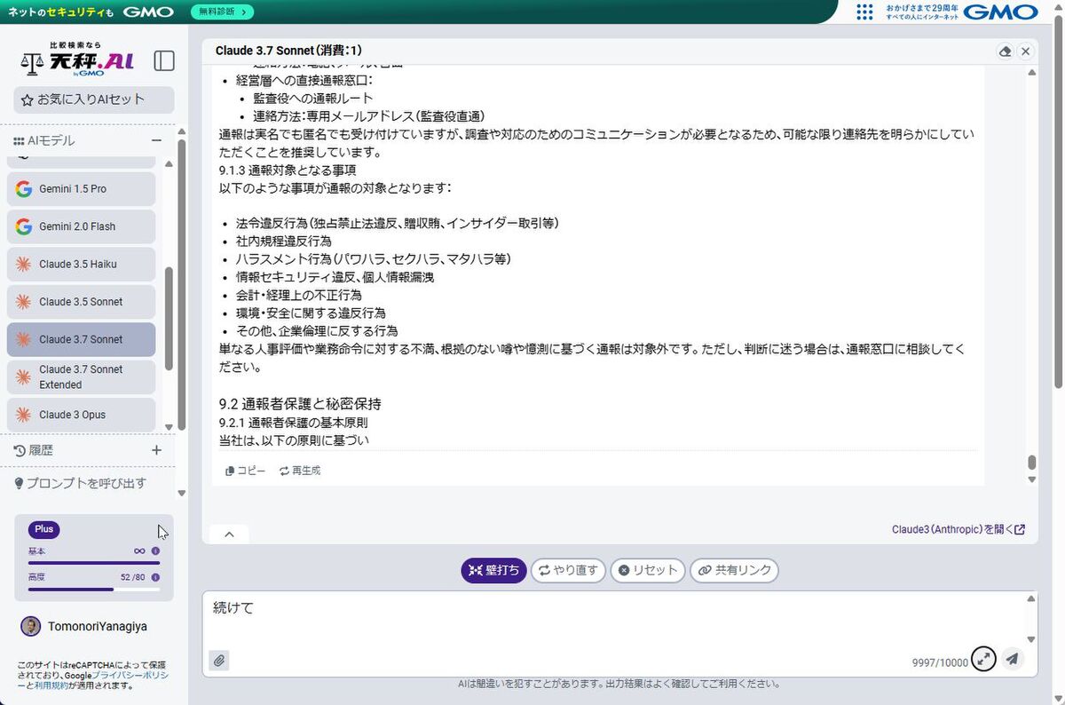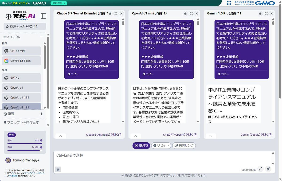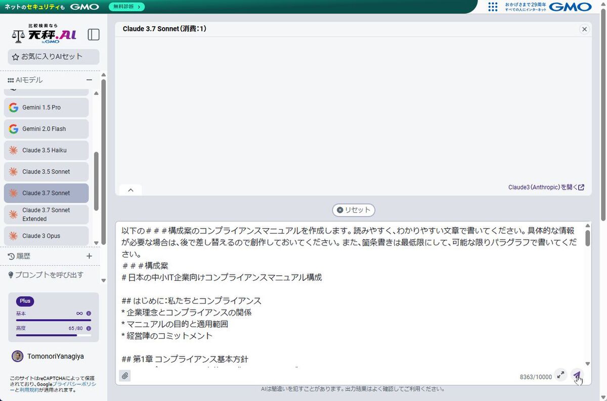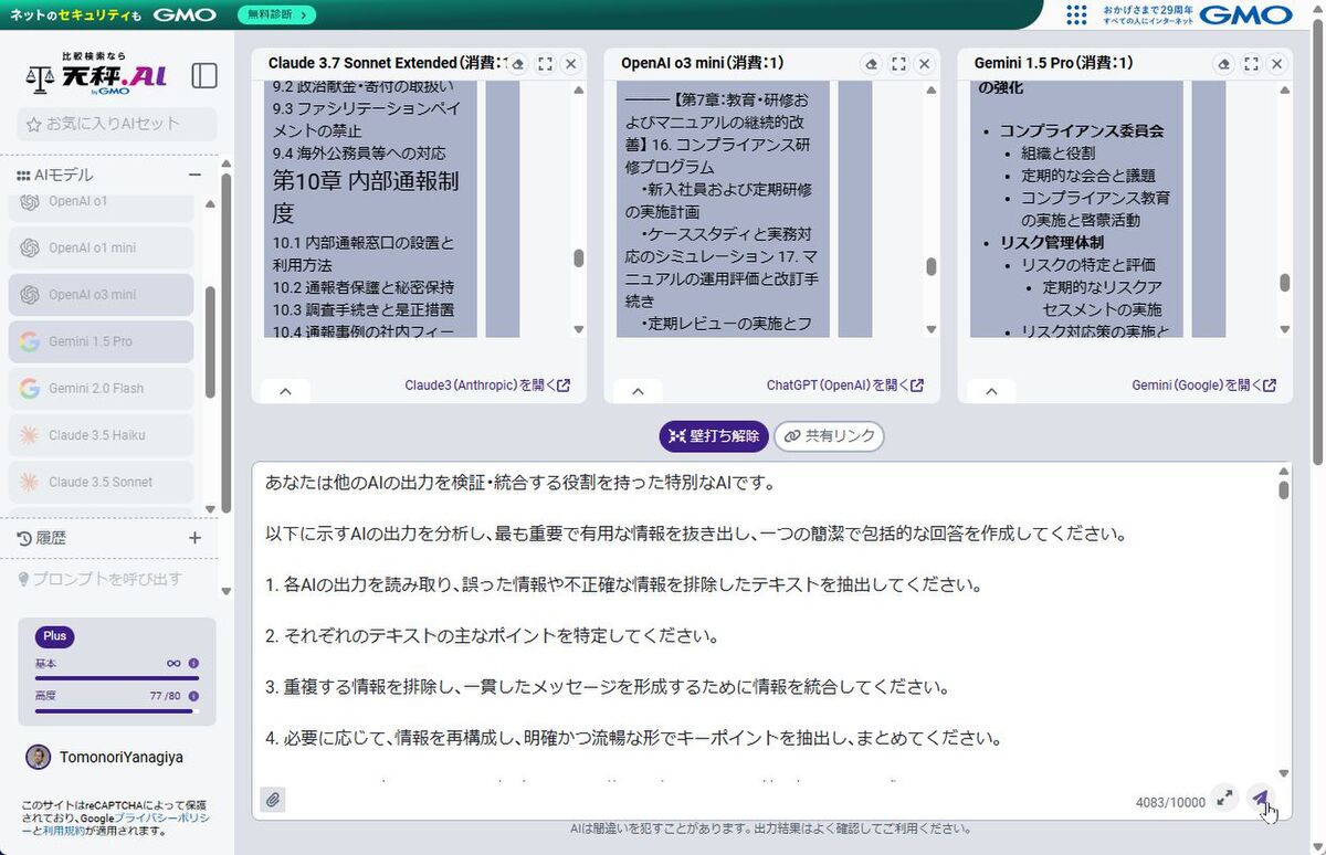 とはいえ、未経験者がゼロからコンプライアンスマニュアルを作るとなると、大きな負担となる。そんな時は生成AIの出番だ。その際、様々な領域にまたがる内容を扱うコンプライアンスマニュアルを作成するので、できれば高性能なAIモデルを使いたいところ。そこで、今回はClaude 3.7 Sonnet ExtendedやOpenAI o3 mini、Gemini 1.5 Proといった高性能なAIモデルを無料で使える「天秤AI」でコンプライアンスマニュアルを作成してみる。
