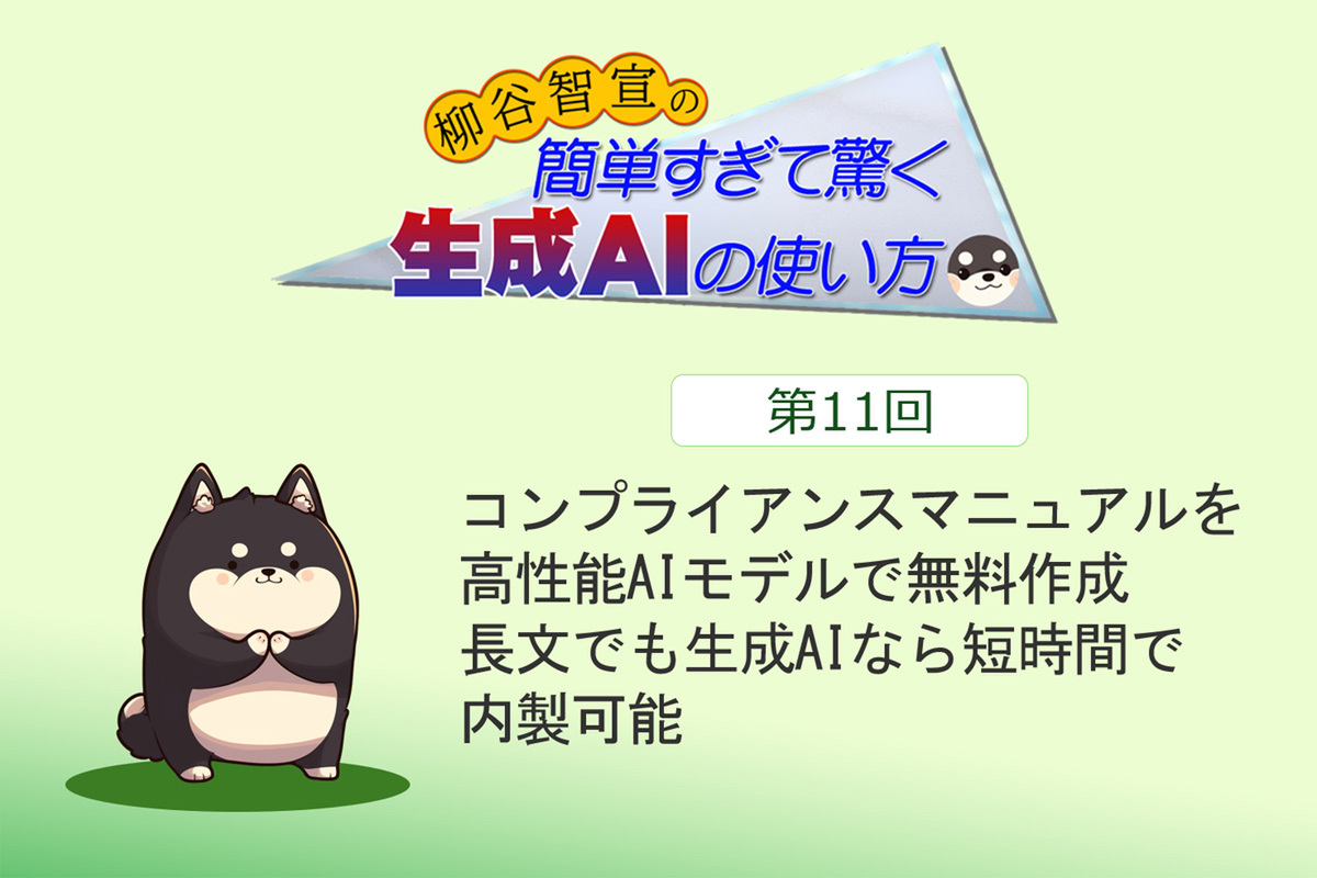 本連載は生成AIをこれから活用しようとしている方たちのために、生成AIの基本やコピペしてそのまま使えるプロンプトなどを紹介。兎にも角にも生成AIに触り始めることで、AIに対する理解を深め、AIスキルを身に着けて欲しい。第11回はいまや必須となっているコンプライアンスマニュアルを生成AIで作成する方法について解説する。