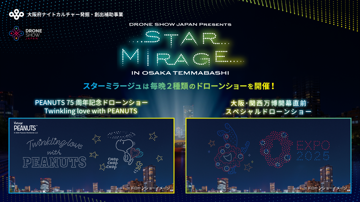 大阪天満橋で8日間連続ドローンショー開催中!PEANUTS75周年&大阪・関西万博記念の無料イベント「STARMIRAGE」