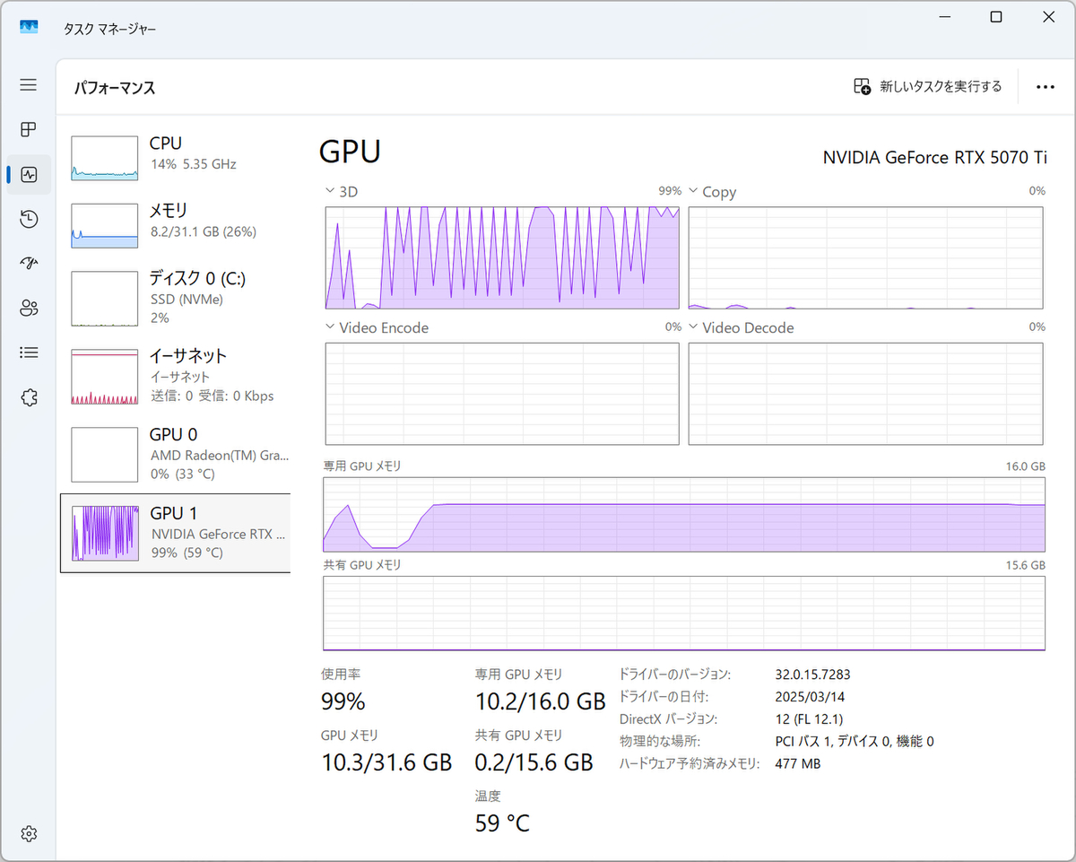 こちらのスコアも優秀で、前世代のGeForce RTX 4080を余裕で下し、RTX 5080に迫る結果となっている。GeForce RTX 5070 TiはVRAM 16GBなのもあり、AI用途にも安心して使える。