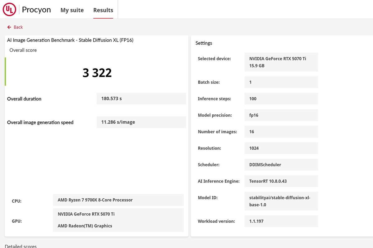 まずは1024×1024ピクセルの画像を生成する「Stable Diffusion XL (FP16)」をNVIDIA TensorRTで実行すると、RTX 5070 Tiの性能をしっかりと引き出しているスコア、生成時間となっている。