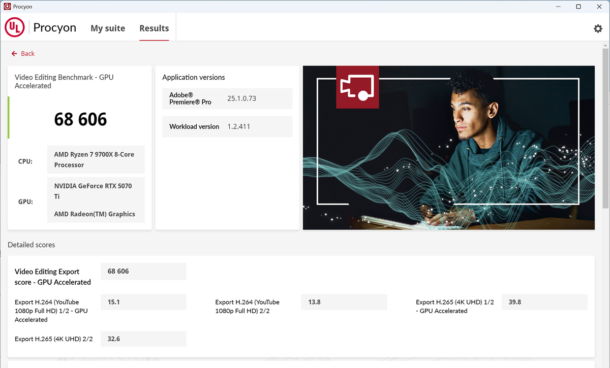 まずは「Adobe Premiere Pro」で実際に動画エンコードを行ない、その速度をスコア化して性能を示すUL Procyonの「Video Editing Benchmark」のスコアをみてみよう。
