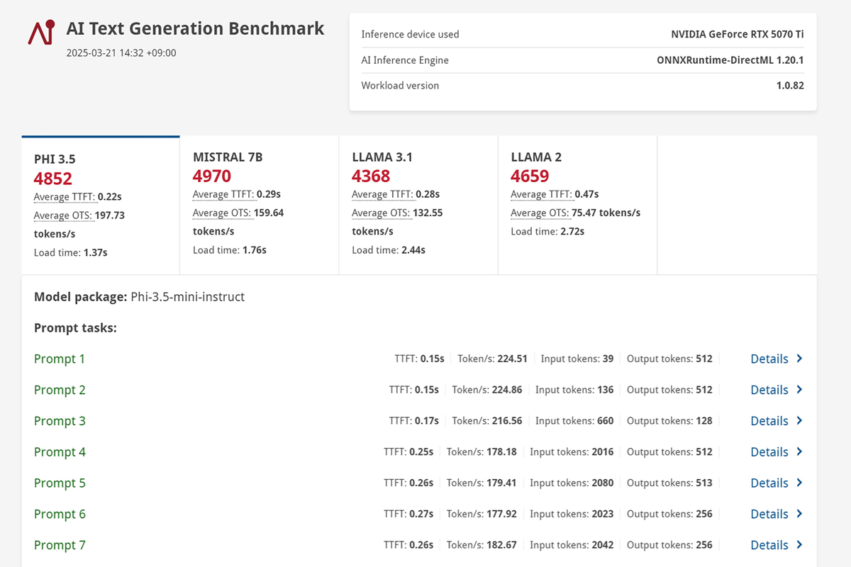 続けて、大小4つの学習モデルにそれぞれ7つのテキスト生成タスクを課して、出力されるトークン(単語)生成スピードなどから、スコアを出す「AI Text Generation Benchmark」を実行していこう。
