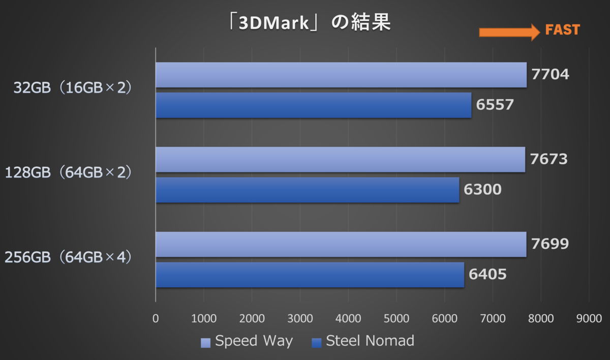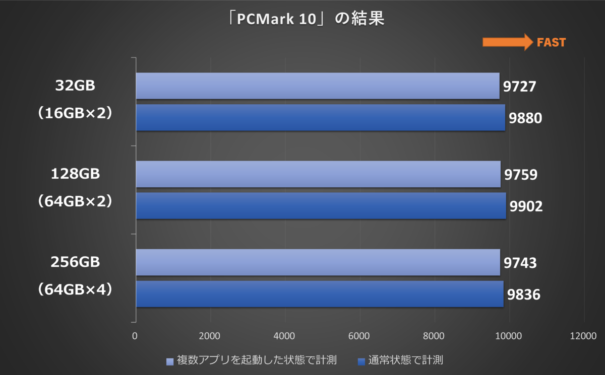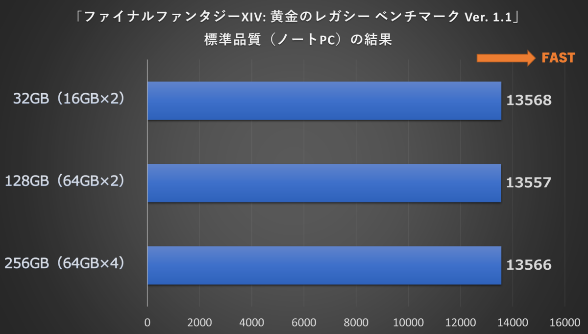 もう1つ、ゲームベンチ「ファイナルファンタジーXIV: 黄金のレガシー ベンチマーク Ver. 1.1」も同様に実行してみたが、こちらもごくわずかな違いで誤差の範囲内という結果となった。どうやら、この手のベンチマークテストではメモリー容量で差はつかず、しかも転送速度の違いでもほぼ互角という結果となった。