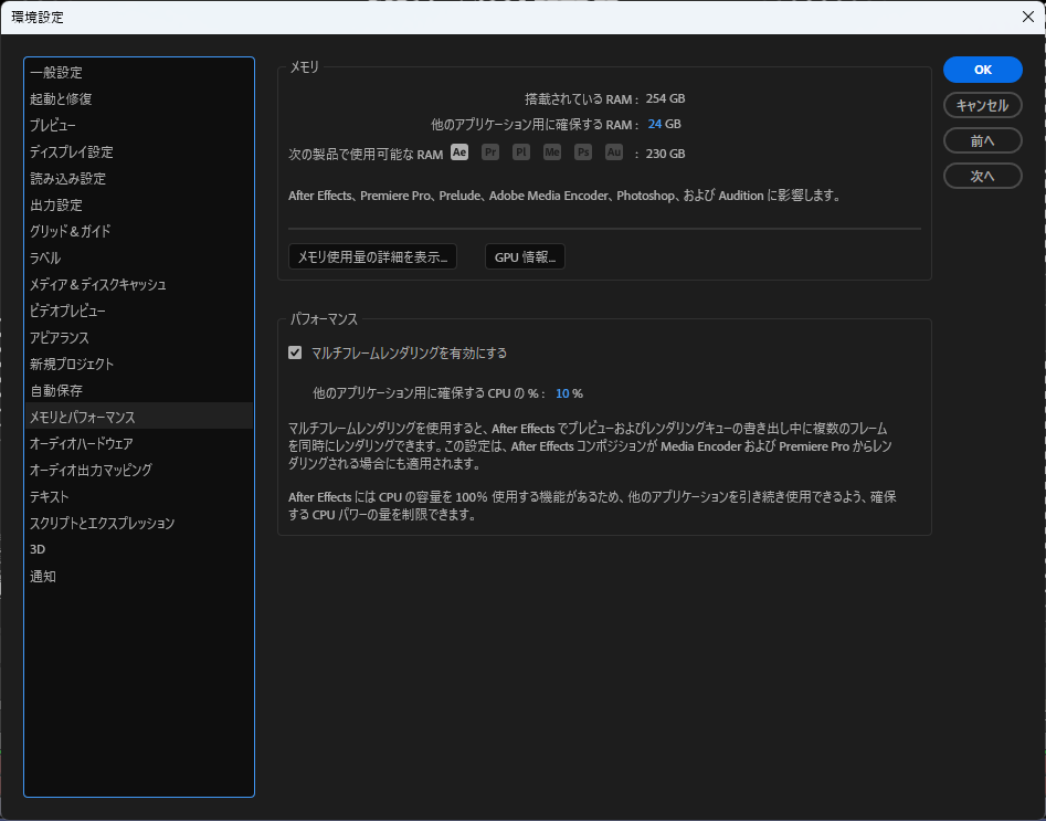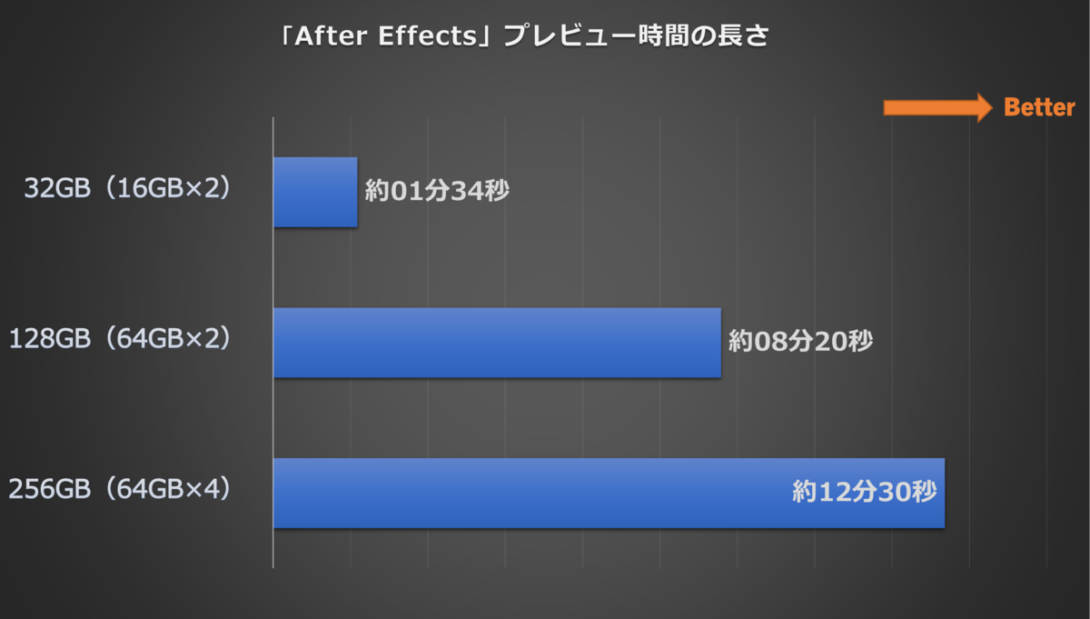 こうした結果から、4枚差しにしても、転送速度の違いによって気にするほど速度が低下する事態にはならないことがわかった。ゲームにしてもアフリにしても動作速度的にはほぼ変わらない。では、メモリー容量によって差が出てくる部分はどこなのか。一例として「Adobe After Effects」で制作時の動作に違いが生じる。