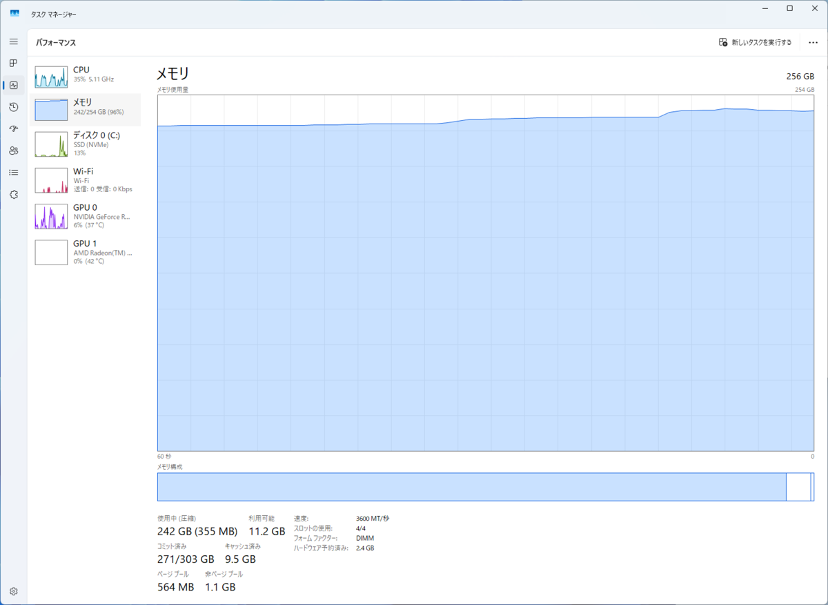 結果は、32GBだとわずか約1分34秒だが、256GBだと約12分30秒もメモリー上に確保できる。作業時に長時間確保できていれば、それだけ作業がスムーズに進む。256GBでも問題なく動作しており、クリエイティブな作業で効率を求めるのであれば、メモリー容量は重要になってくると言えよう。