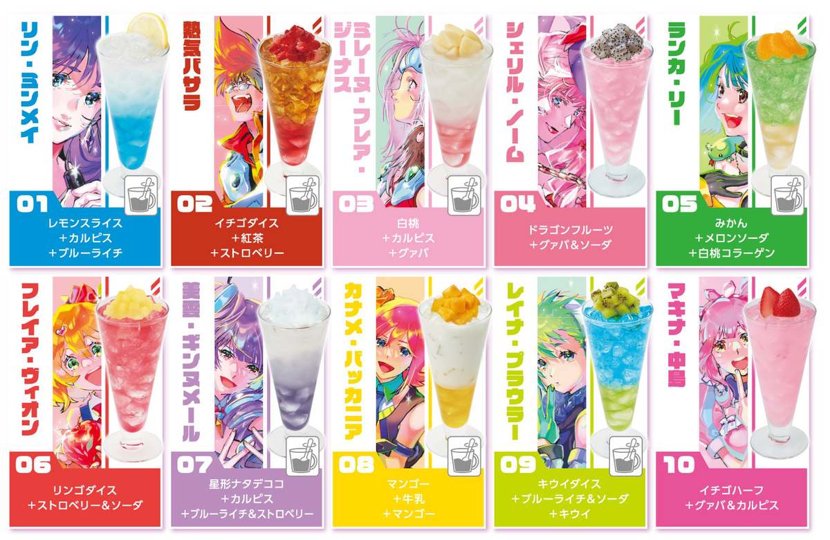 コラボドリンクは、「マクロス」の歌姫をフィーチャーし、「リン・ミンメイ」や「シェリル・ノーム」など、ファンには馴染みのあるキャラクターをテーマにした全10種類が揃う。これらのドリンクを注文すると、特典として、全10種の中からランダムに選ばれたオリジナルポストカードが1枚進呈される。