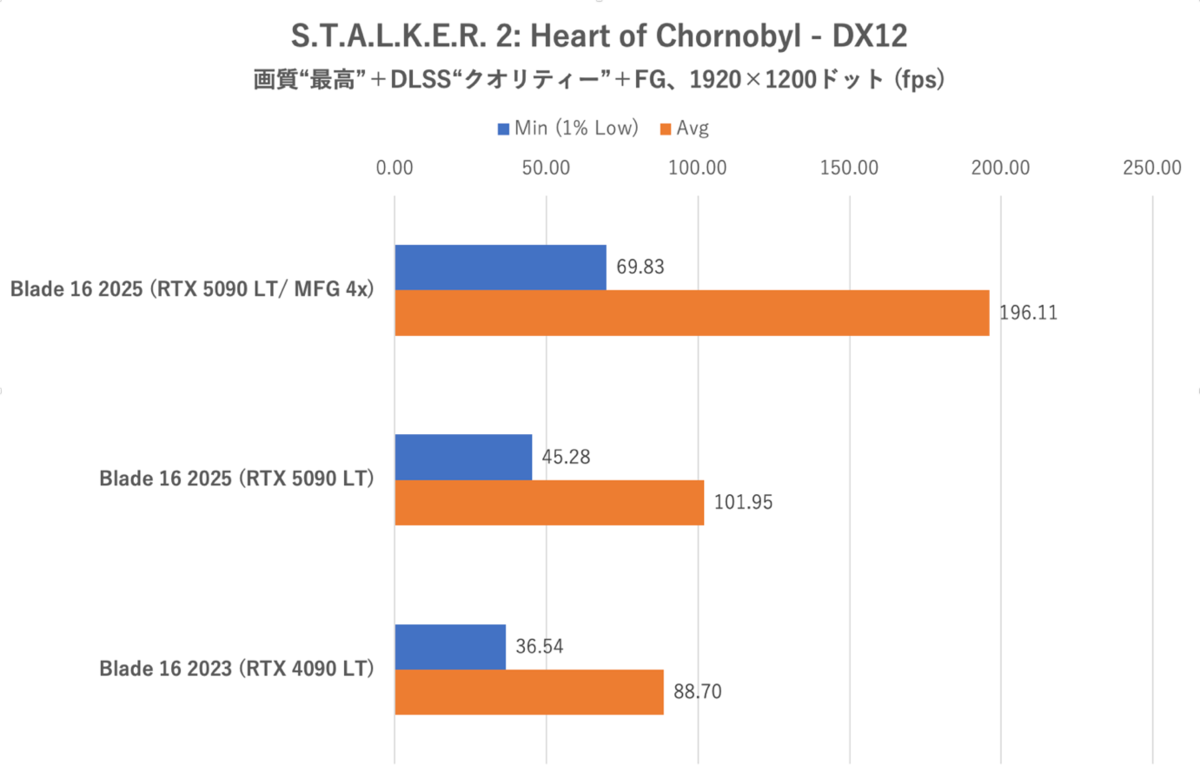 しかし、単なるDLSS FGのみでは最低フレームレートの落ち込み方が激しく60fpsの維持は非常に困難である。そこで、DLSS MFGを加えることにより、最低フレームレートの落ち込みが劇的に緩和され、平均フレームレートもRazer Blade 16 (2023)の約2.1〜2.2倍にまで向上できた。