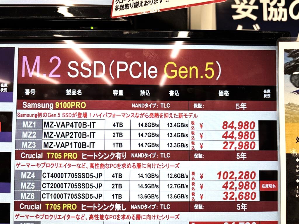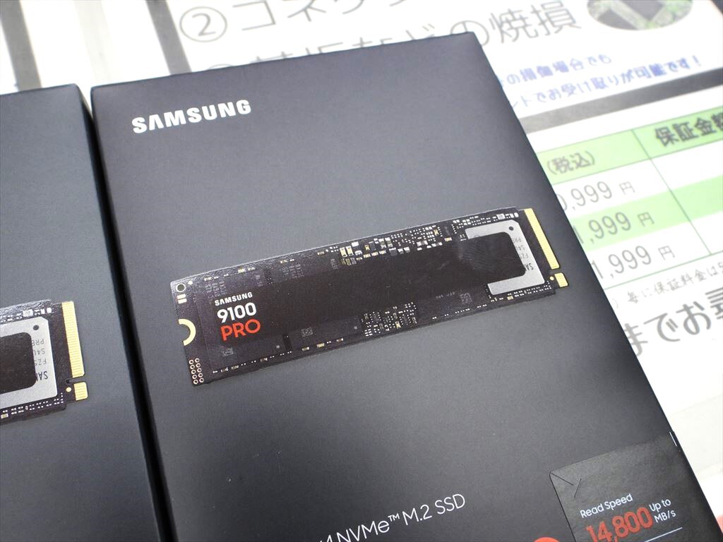 PCIe 5.0 x4対応のNVMe SSD「Samsung SSD 9100 PRO」シリーズが発売された。ラインナップは容量1TB「MZ-VAP1T0B-IT」(2万7980円)、2TB「MZ-VAP2T0B-IT」(4万4980円)、4TB「MZ-VAP4T0B-IT」(8万4980円)の3モデル。秋葉原ではパソコンショップアーク、オリオスペック、パソコン工房 秋葉原パーツ館、ソフマップAKIBA パソコン・デジタル館、ツクモパソコン本店、TSUKUMO eX.で販売中だ。