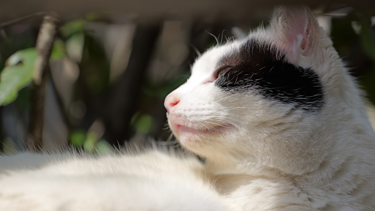 とある神社で日なたぼっこしてるところを、そっと隙間から狙ったもの。カメラを向けていたら、それに気づいた参拝客の子どもが「猫だ」と言い、そっちに顔を向けた瞬間の図。