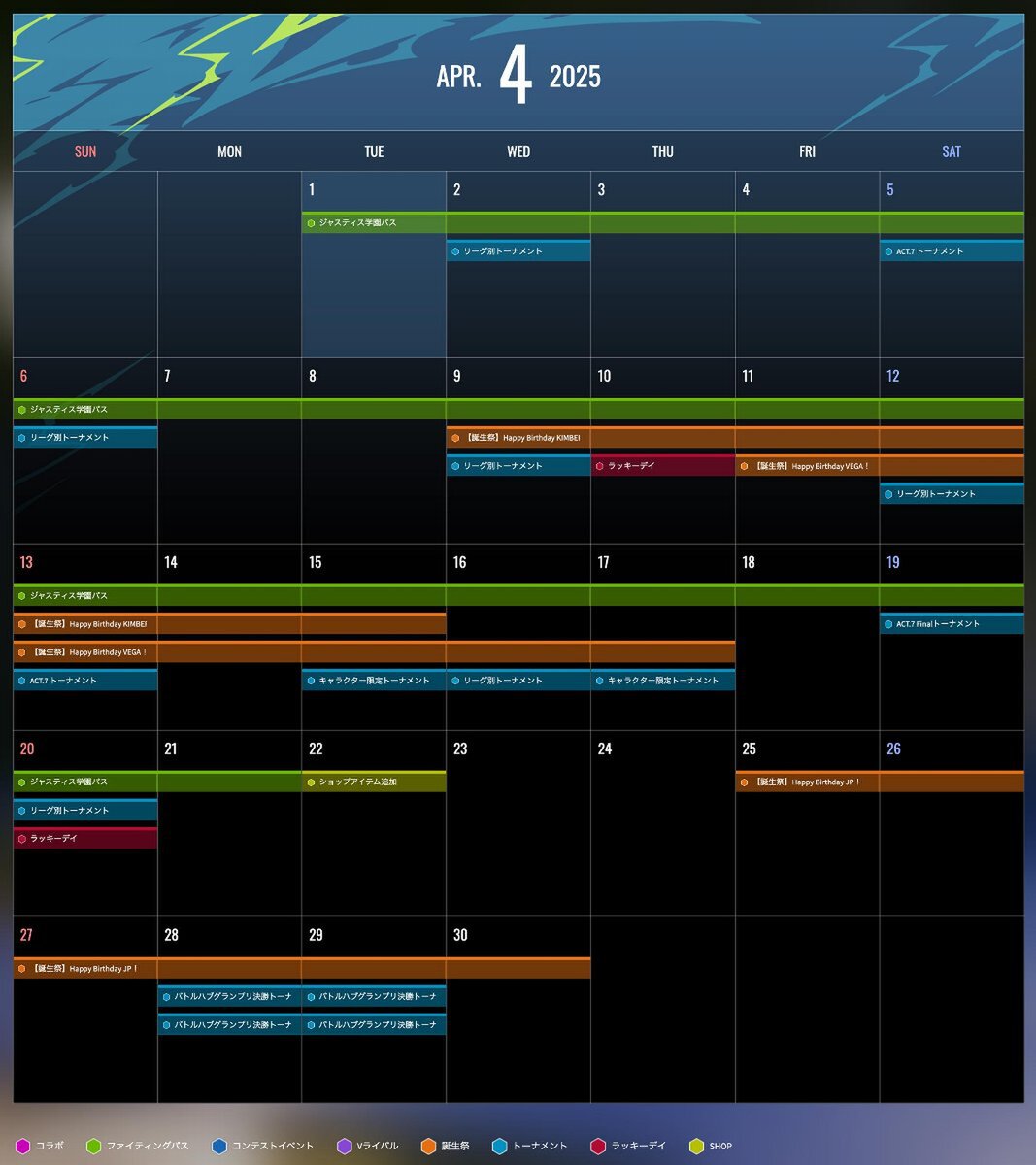 4月は「キンバリー」「ベガ」「JP」の誕生祭を開催。キャラ限定トーナメントに参加しよう。そのほかにもバトルハブで開催されるファイティングパスやチャレンジのリワードの情報も掲載しているので、プレイ前にチェックして、もらさずリワードをゲットしよう。