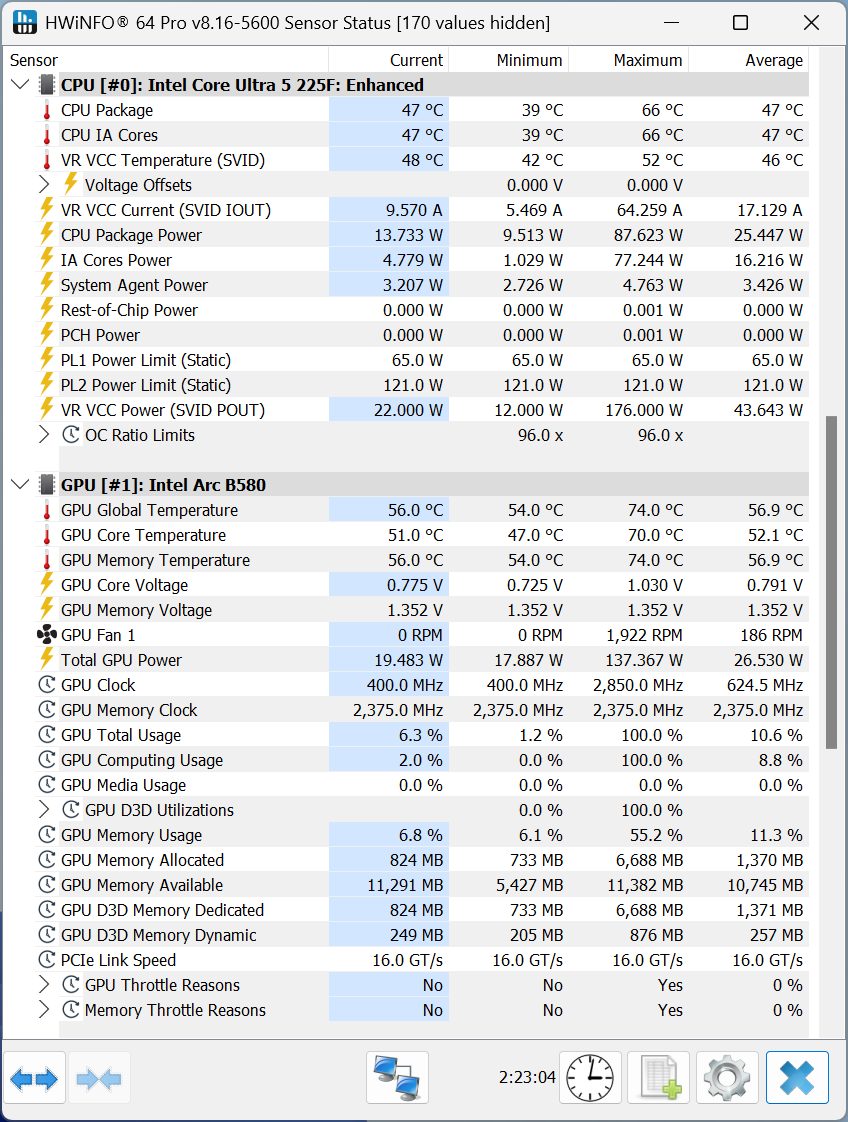 まずはPC性能の前に、小型PCで気になる冷却性能から。Core Ultra 5 225FはGPU機能がない、6つのPコアと4つのEコアを備える10コア/10スレッドのCPU。標準の電力制限はプロセッサーのベースパワー(PL1)が65W、最大ターボパワー(PL2)が121Wになる。