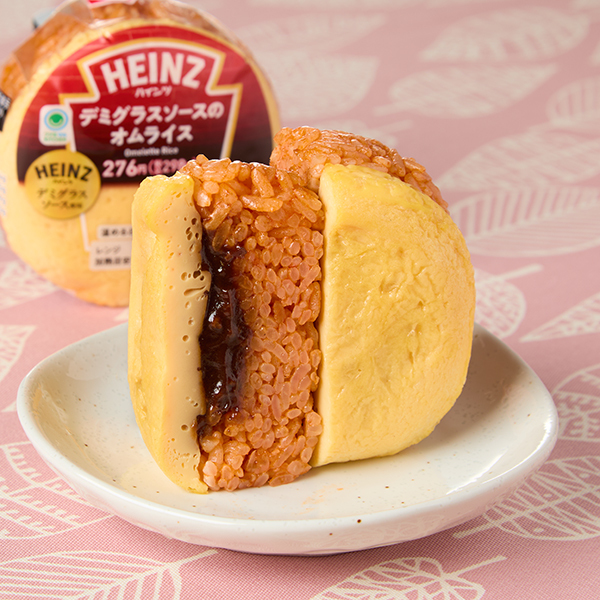 ハインツのトマトケチャップなどで味付けしたチキンライスと、ふんわりたまごのオムレツで、ハインツのデミグラスソースで深い味わいに仕上げた牛ひき肉入りのデミソースを挟んでいる。
