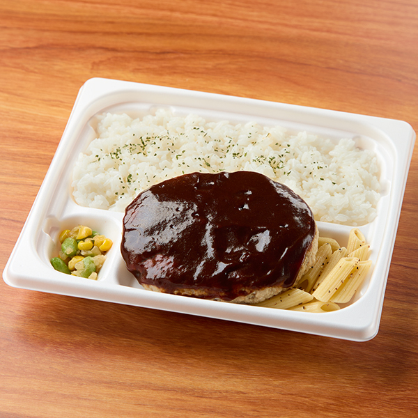 ハインツのデミグラスソースを使用した濃厚なソースの味わいとボリューム満点のハンバーグが楽しめるお弁当。