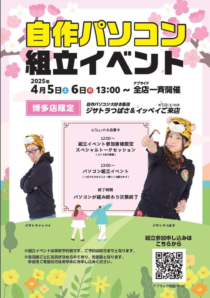 こんにちは、ジサトライッペイです。先日から告知させていただいておりました、アプライド博多店の「自作パソコン組立イベント」が近づいてまいりました。日程は2025年4月5日。ジサトラつばさも今や遅しと腕をぐるんぐるん回しております。