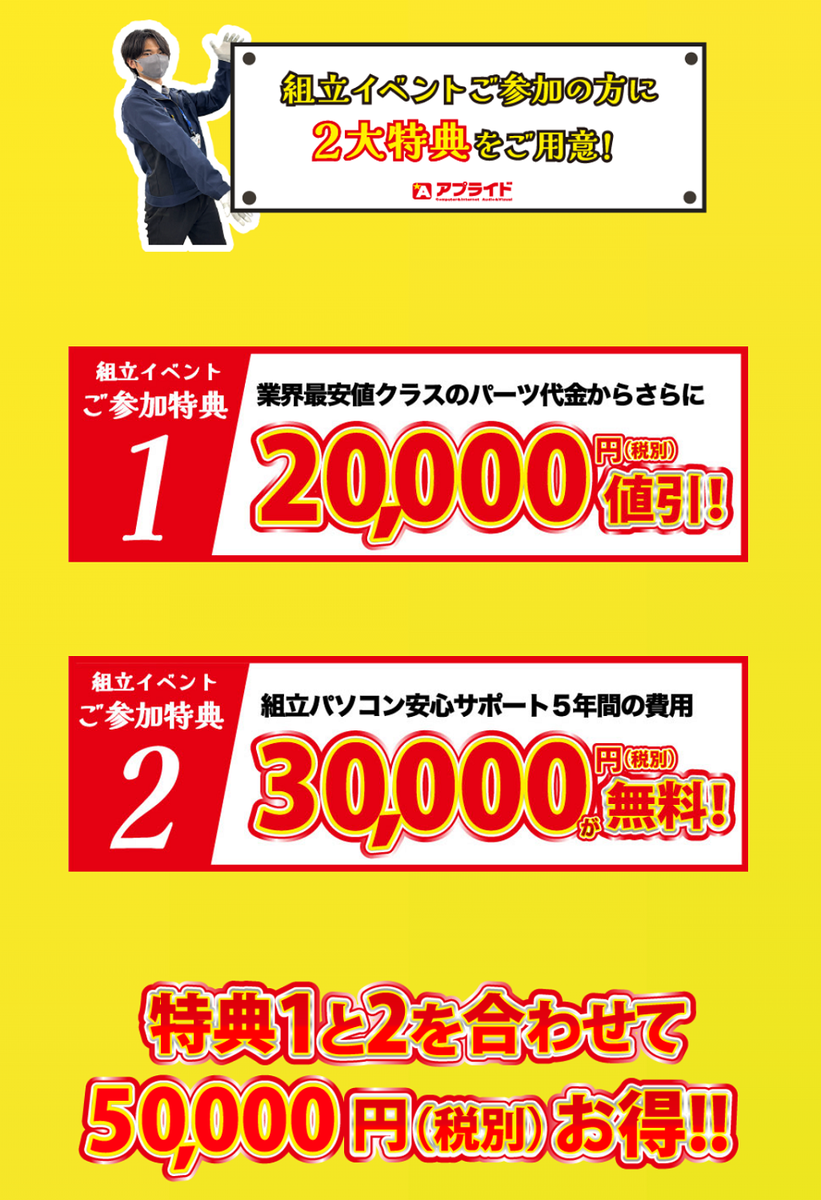 本イベントは参加特典が激アツです。まずイベント限定PC組立セットは通常価格より税込み2万2000円引き。元値も業界最安クラスをうたっておられるゆえ、物価高のご時世にありがたい限りです。