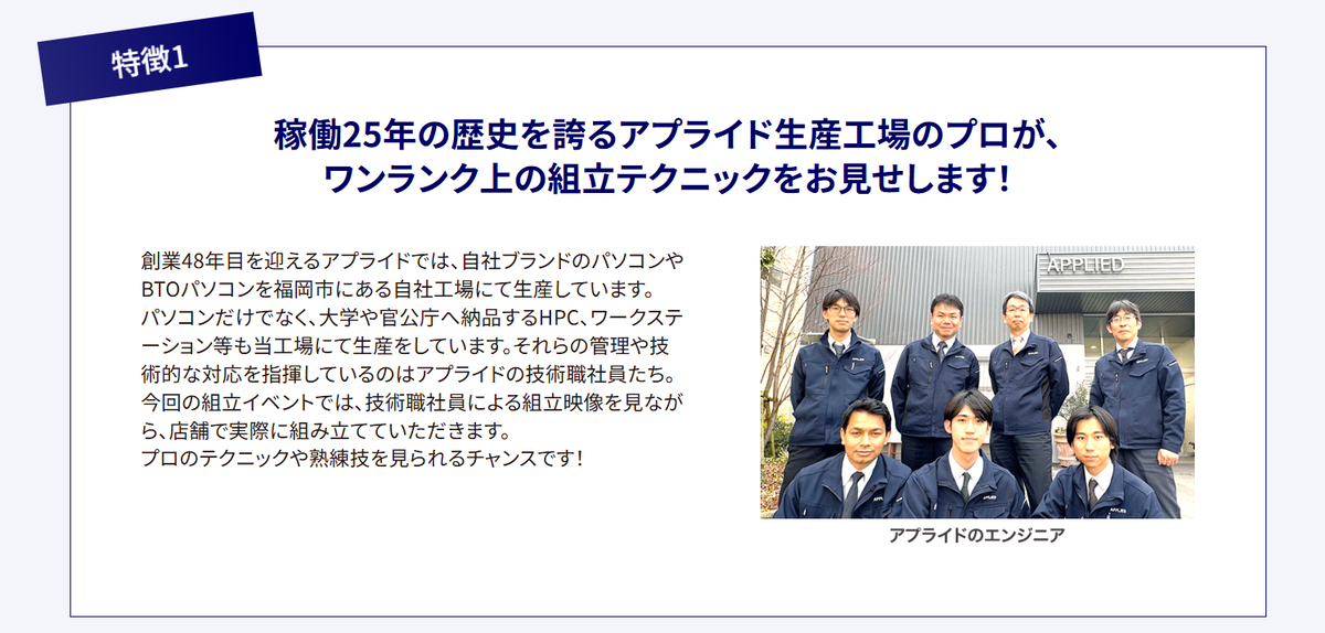 ちなみに、アプライド博多店の横にはBTOパソコンの生産工場もあるので、その現場で働くプロの御業が見られるチャンスです。当たり前ですが、僕みたいな「在野のPC自作自信ニキ」ではなく、日々業務としてPCを組み立てている正真正銘の「匠」です。僕も楽しみにしております。