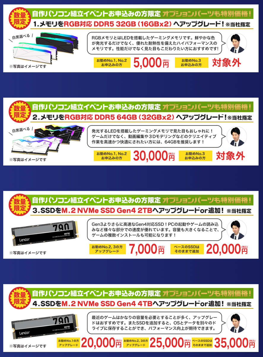 なお、イベント限定PC組立セットは先日お伝えした3モデルですが、数量限定でメモリーやストレージなどのアップグレード(あるいは追加)もできます。PC組立イベント限定セットのカスタマイズって結構珍しいですよね。