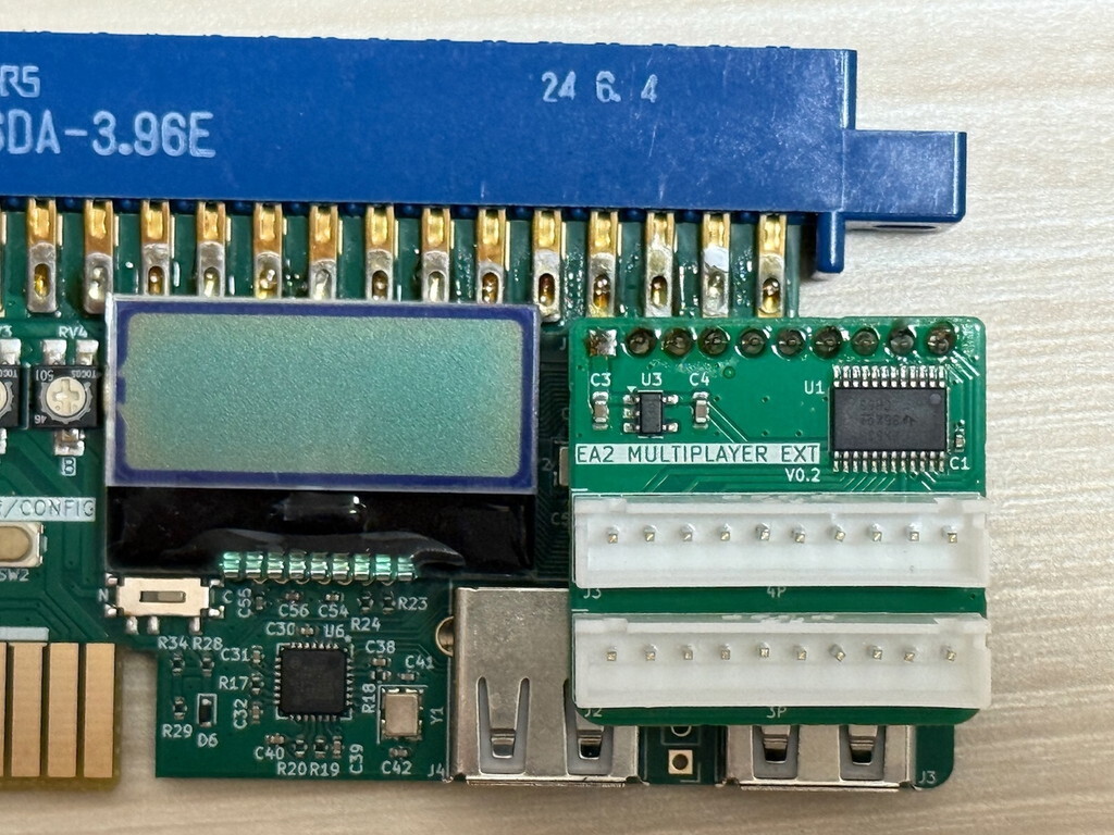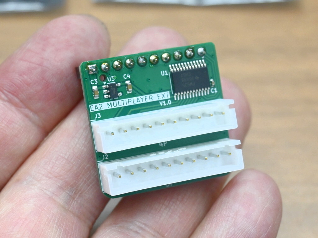 EASY ARCADE2専用 マルチプレイヤー拡張アダプタは、3P/4Pのマルチプレイ用に追加のコントローラを増設可能にする拡張基板。上記同様にEASY ARCADE 2の拡張端子に接続することから、アナログアダプタとはどちらかしか使用できない。