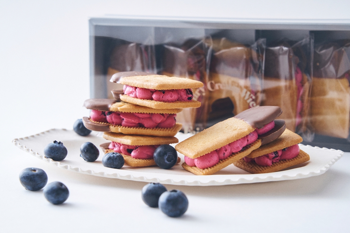 小粒ながら味わい深いポーランド産の野生種ブルーベリーと、酸味のきいたカシスを果実まるごと煮込んだ、自家製「ブルーベリーカシスジャム」を使用。生クリーム入りのフレッシュなバタークリームにたっぷりと混ぜ込み、素材の味を引き出した特製「ジャム生バタークリーム」に仕上げています。そのすっきりとした甘酸っぱさが広がるクリームを、ミルクチョコレートでハーフコーティングした香ばしいビスケットで、一つひとつ丁寧にサンドしています。