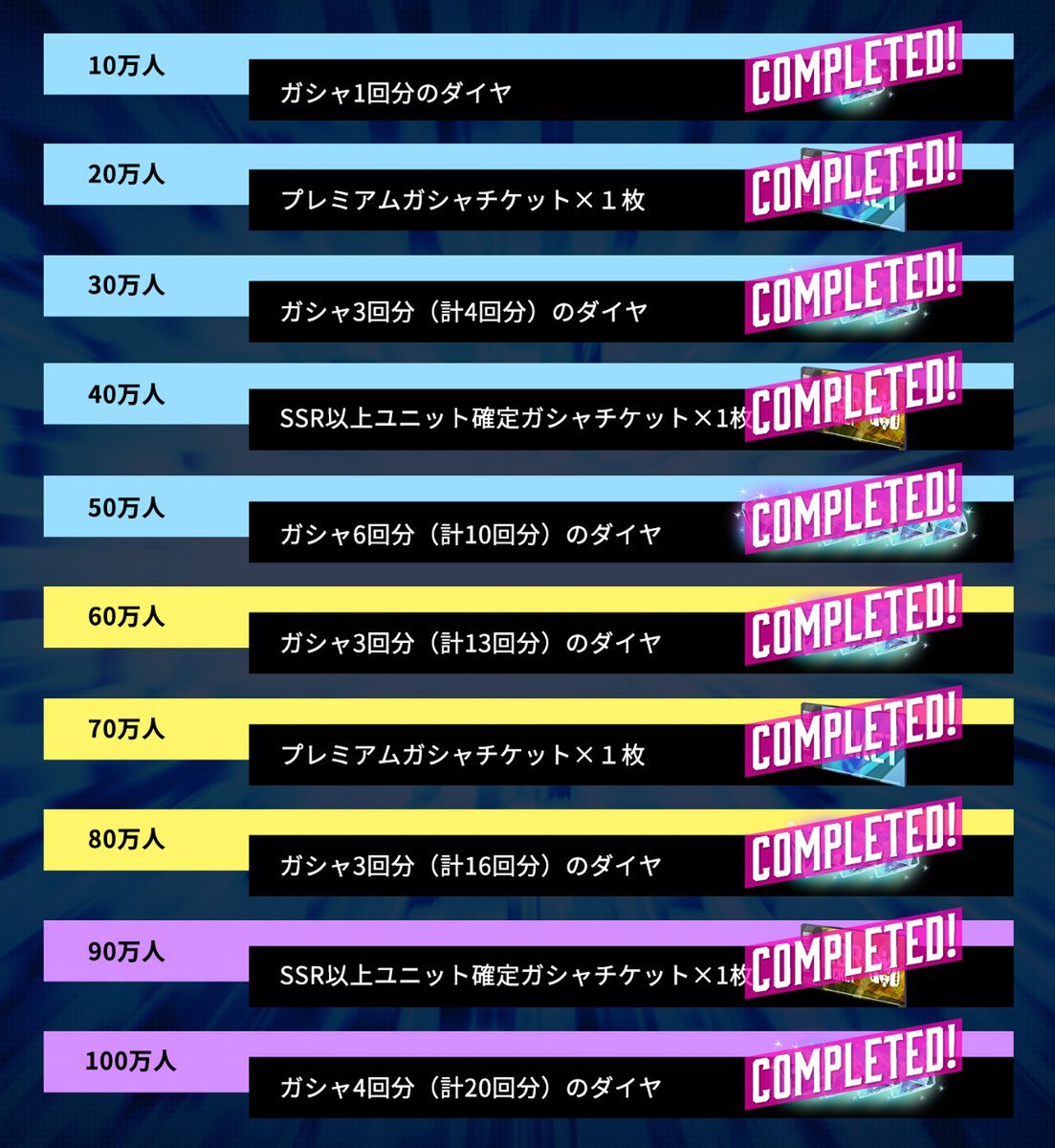 100万人突破 ⇒ ガシャ4回分(計20回分)のダイヤ 達成済