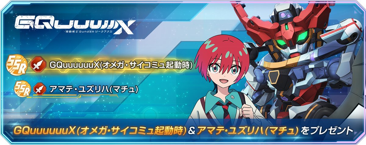 「機動戦士Gundam GQuuuuuuX(ジークアクス)」より、SSR「GQuuuuuuX (オメガ・サイコミュ起動時)」、SSR「アマテ・ユズリハ(マチュ)」を全員にプレゼント!